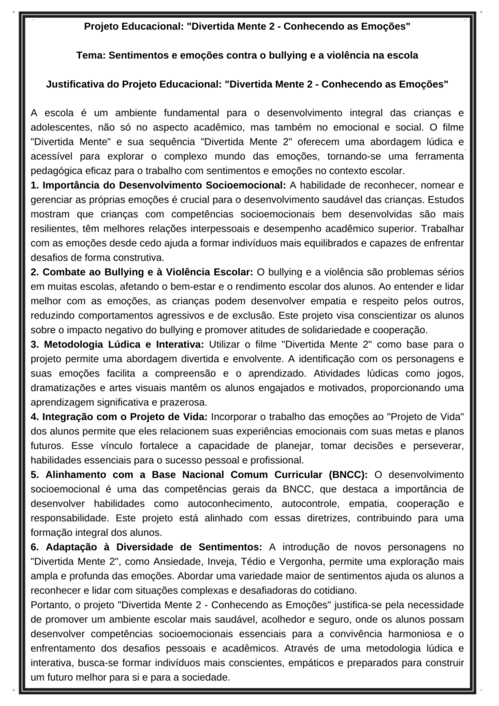 Apresentamos o projeto "Divertida Mente 2 - Conhecendo as Emoções", uma proposta inovadora e educativa para trabalhar temas essenciais como sentimentos e emoções, com foco no combate ao bullying e à violência nas escolas. Inspirado nos filmes Divertida Mente e Divertida Mente 2, este projeto é ideal para alunos da Educação Infantil até o 5º Ano do Ensino Fundamental I, proporcionando uma maneira lúdica e eficaz de abordar o desenvolvimento socioemocional.